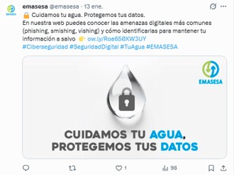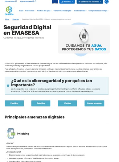 La empresa metropolitana ha lanzado la campaña de concienciación “Cuidamos tu agua. Protegemos tus datos”, que incluye formación de la propia plantilla e información para la ciudadanía. De hecho, EMASESA ha habilitado en su web corporativa una nueva sección dedicada a la ciberseguridad. En este espacio, cualquier usuario puede encontrar información clara sobre las amenazas digitales más habituales, consejos para identificar correos sospechosos, proteger datos personales y evitar fraudes en internet.
