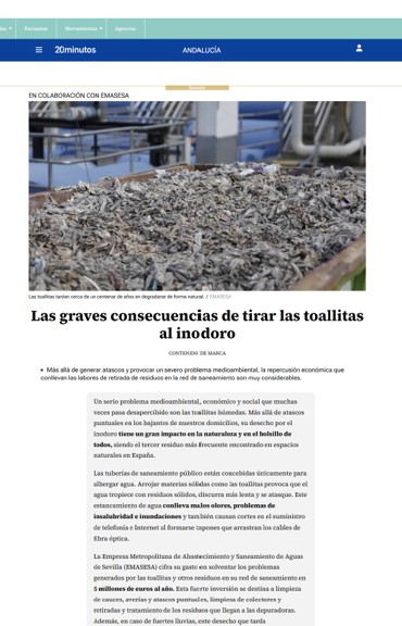Cada año se retiran toneladas de toallitas de nuestras tuberías y cauces. Para paliar los problemas generados por las toallitas y otros residuos que discurren por nuestra red de saneamiento, EMASESA gasta alrededor de 5 millones de euros al año que se destinan a la limpieza de cauces, averías y atascos puntuales, limpieza de colectores y retiradas y tratamiento de los residuos que llegan a las depuradoras.