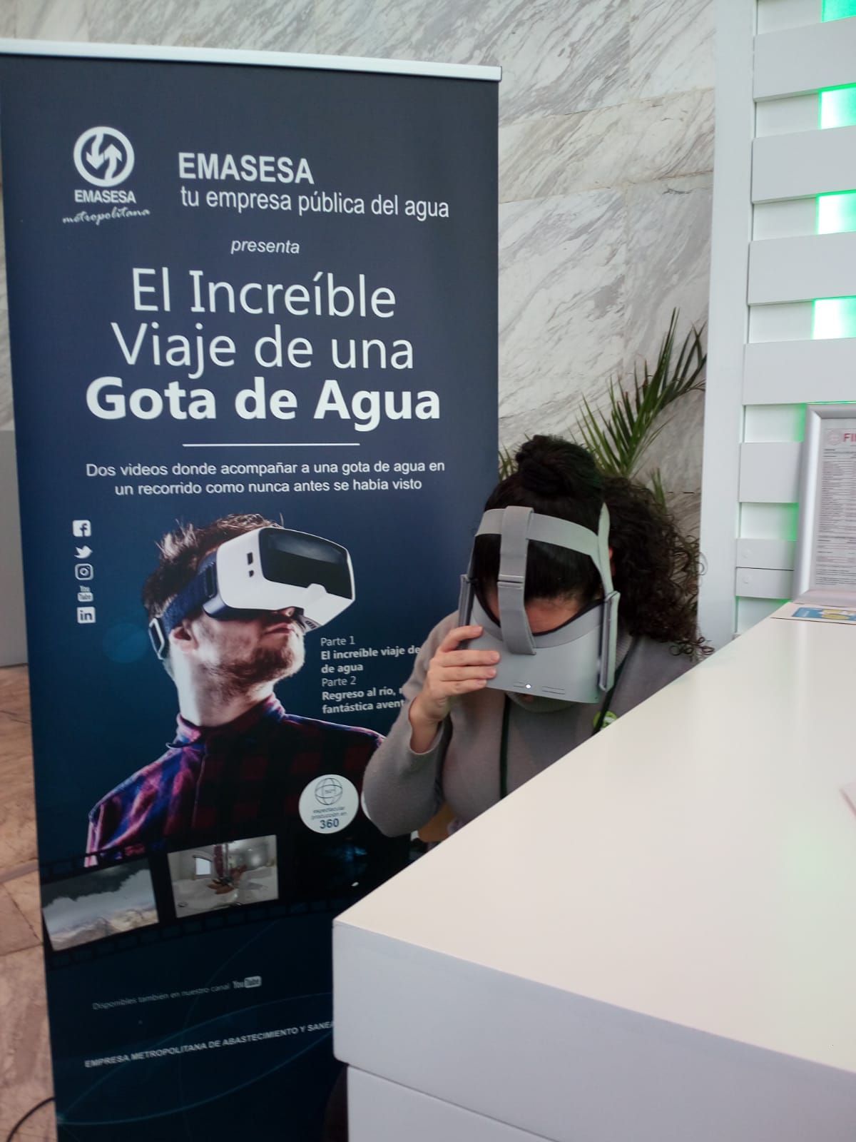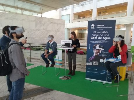 Así mismo, EMASESA estuvo presente en el Stand número 4 presentando en su espacio “El increíble viaje de una gota de Agua” donde a través de gafas de realidad virtual 360º, los visitantes “sumergidos en una gota de agua” pudieron disfrutar de dos videos: un primer video con el recorrido del agua desde las nubes al río pasando por el embalse y la potabilizadora, y un segundo video que devuelve a la gota de agua de nuevo al río pasando por la red de saneamiento y la estación depuradora de aguas residuales de El Copero.