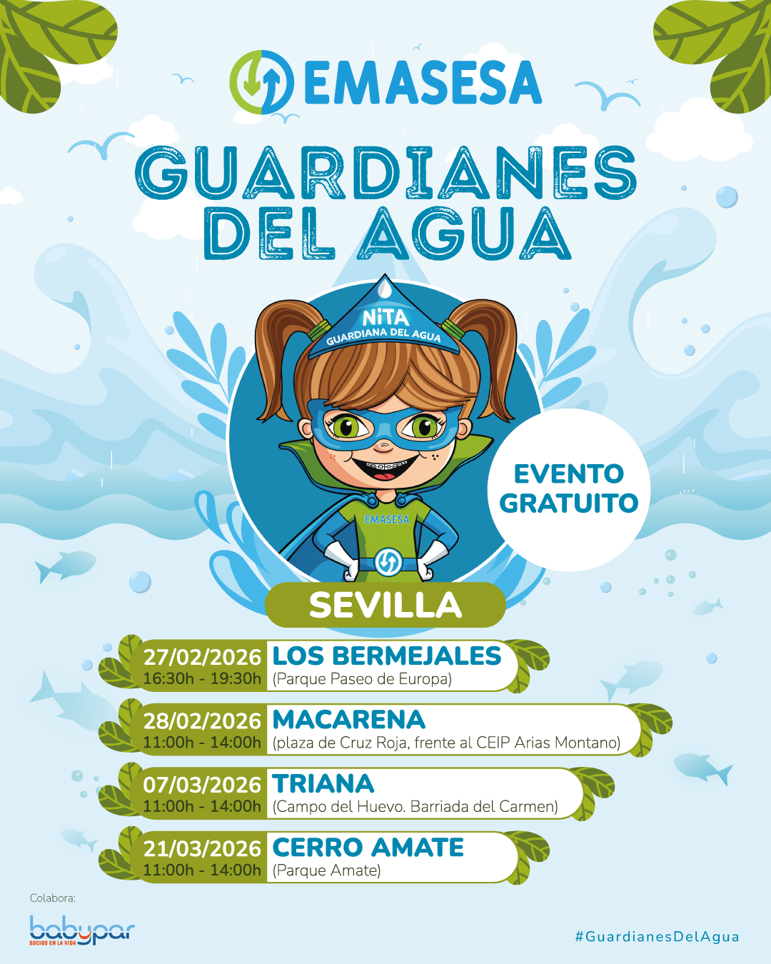 La gran protagonista es Nita, la Guardiana del Agua, un personaje creado por EMASESA que invita a los más pequeños a convertirse en guardianes y guardianas de este recurso esencial, demostrando que cada pequeño gesto cuenta para cuidar el agua y el entorno.
