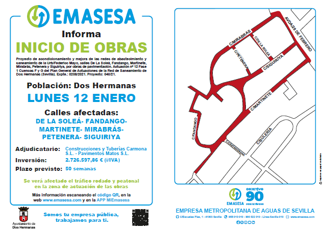 EMASESA, en coordinación con el Ayuntamiento de Dos Hermanas está realizando obras de renovación de las redes de abastecimiento y saneamiento de la barriada Federico Mayo en las calles Soleá, Fandango, Martinete, Mirabrás, Petenera y Siguiriya que mejorarán el servicio y supondrán la reposición de la totalidad del pavimento.