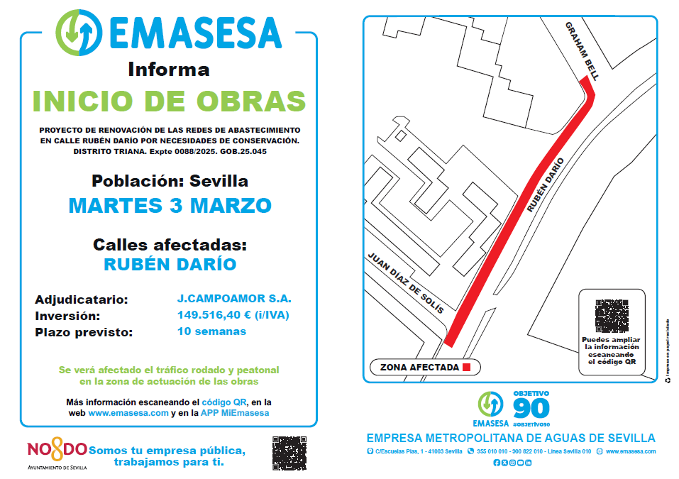 EMASESA, en coordinación con el Ayuntamiento de Sevilla comenzará el próximo 3 de marzo el proyecto de renovación de las redes de abastecimiento de la calle Ruben Darío del distrito Triana entre las calles Juan Díaz Solis y Grahan Bell con objeto de mejorar la presión, el caudal y la eliminación de fugas.
