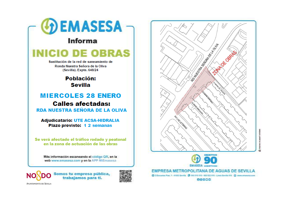Las obras de sustitución de la red de saneamiento de la calle Nuestra Señora de la Oliva del distrito Sur de Sevilla que EMASESA iniciará mañana miércoles 28 de enero tienen por objeto mejorar el servicio de saneamiento y contarán con la repavimentación a partir de aglomerado en calzada y loseta hidráulica en acera.