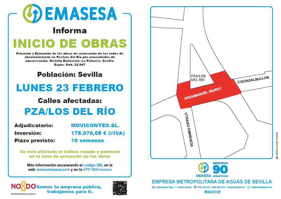 EMASESA, en coordinación con el Ayuntamiento de Sevilla comenzará el próximo lunes 23 de febrero el proyecto de renovación de las redes de abastecimiento de la Plaza Los del Río del distrito Bellavista-La Palmera, que incluye, además, la sustitución de parte de la valvulería de la avenida Manuel Siurot y de la carretera de Su Eminencia con objeto de mejorar el servicio prestado.