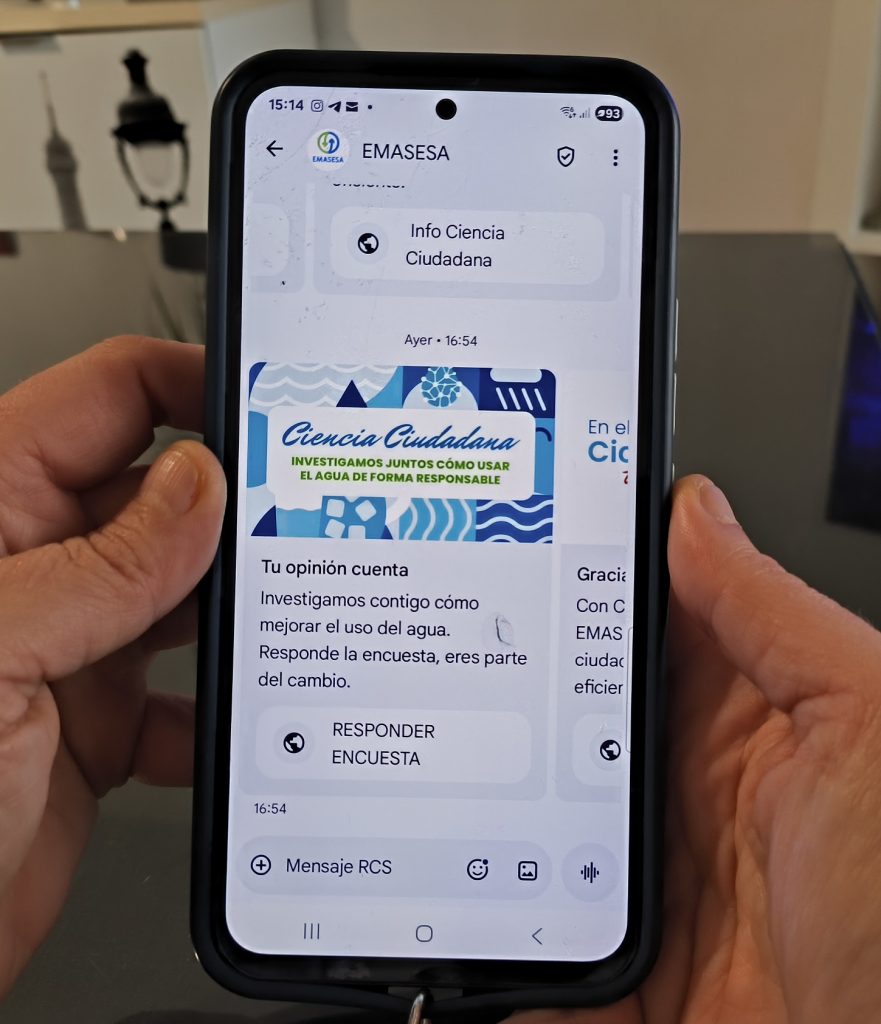 EMASESA, dentro de la investigación de Ciencia Ciudadana, está llevando a cabo una campaña específica para recoger información directa sobre nuestros hábitos de consumo de agua a través de mensajes a móviles y buzoneo de folletos informativos. Esta estrategia, desarrollada junto a la Universidad Pablo de Olavide y enmarcada en el proyecto Embalse Digital 5.0, es una de las acciones actuales dentro del estudio, y está activa en estos momentos.